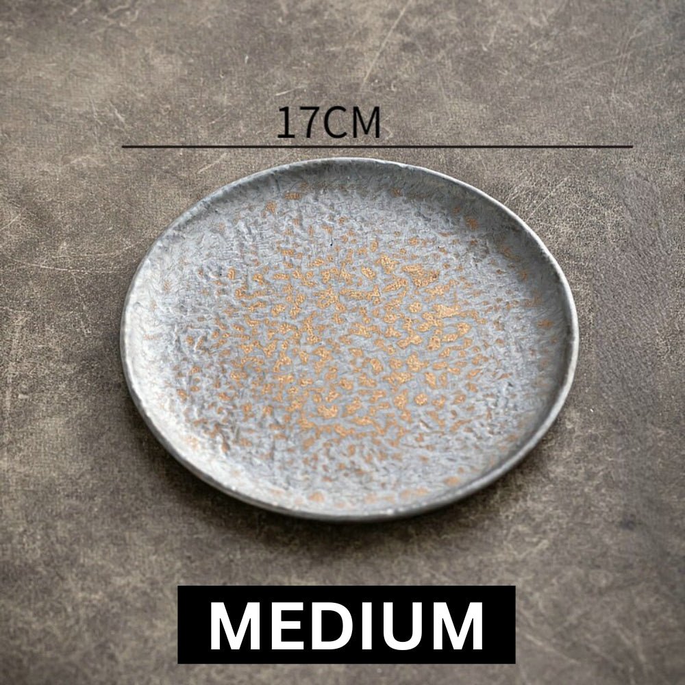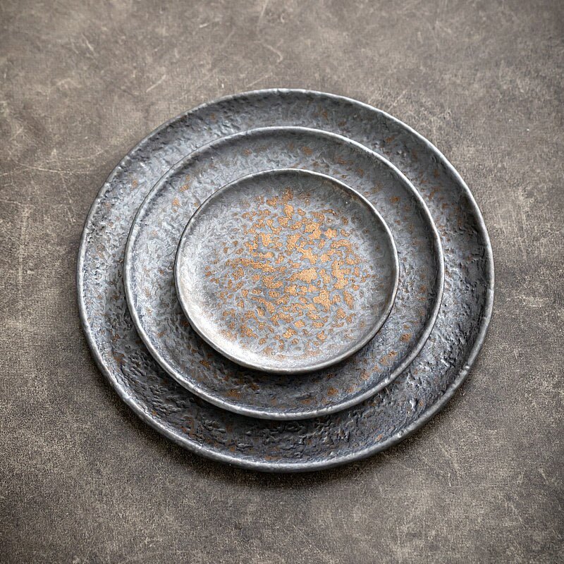 Experience the allure of industrial-inspired dining with our Contemporary Industrial Plate Set. The hammer-divot design creates a sophisticated backdrop for your culinary creations. making every meal a visual delight.