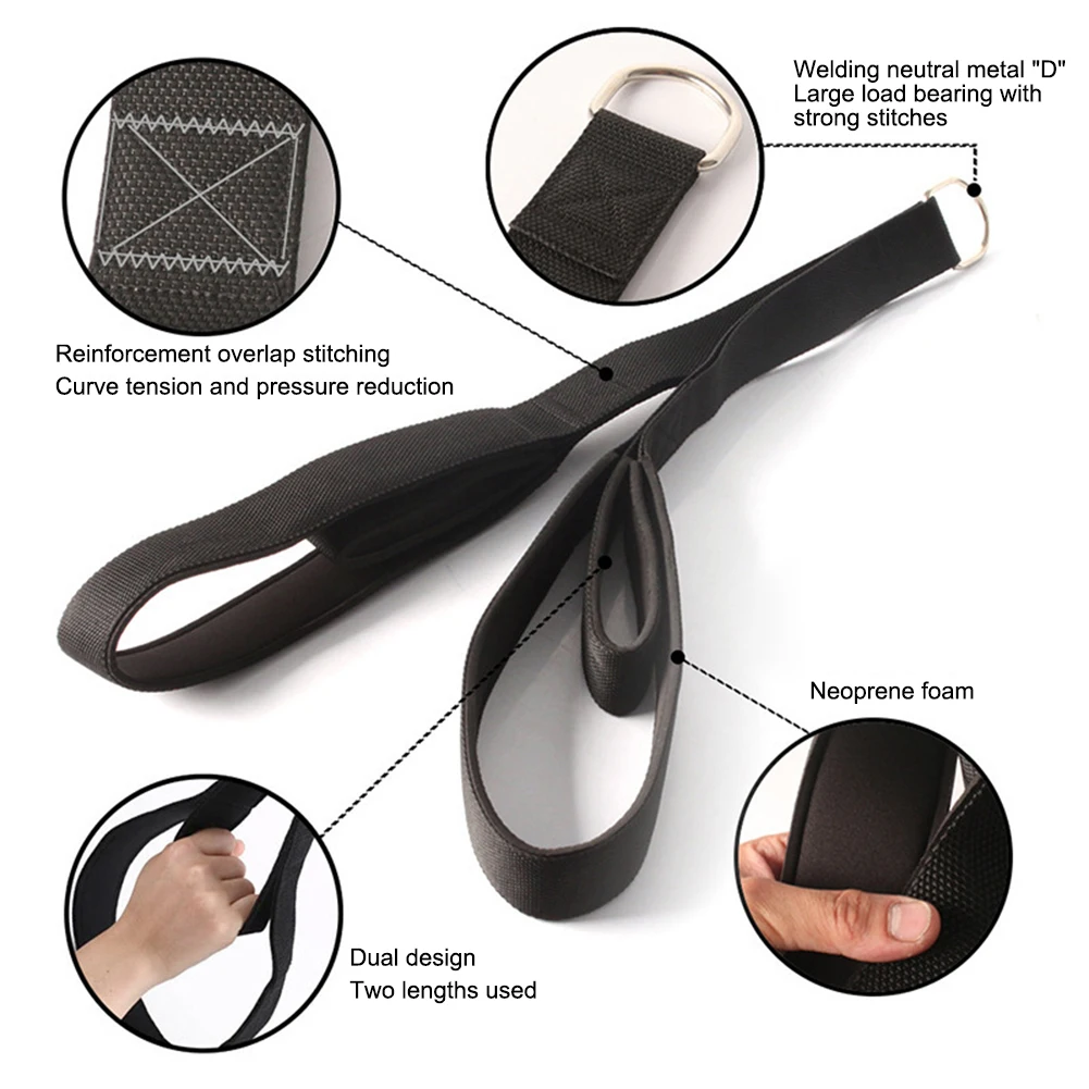 Features: 1. Thick and Anti-Slip Neoprene Foam Material Strap for Strength and Comfort: Our pulldown rope is made from a thick and anti-slip neoprene foam material strap, ensuring exceptional strength, durability, and a comfortable grip. This premium material provides resistance to wear and tear while offering a soft and secure hold without causing discomfort. 2. Reinforced Overlapping Stitching Curves at the Connection Points for Enhanced Durability and Pressure Reduction: The connection points of our tricep exercise rope feature reinforced overlapping stitching curves, which not only enhance durability but also help distribute tension and reduce pressure. This thoughtful design ensures that the strap can withstand rigorous use and provide optimal support during exercises. 3. Large Ring for Ankle Strap or Hand Strap and Small Ring for Wrist Strap: Our fitness arm strength rope features a large ring that can be used as an ankle strap or hand strap, as well as a small ring for wrist strap attachment. This versatile design allows for various uses, whether you need to secure the strap around your ankles, use it as a hand strap, or attach it to your wrists for additional support during workouts. 4. Multi-Purpose Design Suitable for Yoga, Pilates, and Fitness Equipment Training: Our long triceps strap is designed to cater to different training needs and is suitable for yoga, Pilates, and fitness equipment exercises. Whether you’re practicing yoga poses, engaging in core workouts, or utilizing gym equipment, this versatile strap provides the support and flexibility required for a wide range of exercises. 5. Expertly Crafted for Strength, Comfort, and Versatility: Our carabiner pulldown rope is expertly crafted with a concentrate on strength, comfort, and versatility. The thick and anti-slip neoprene foam material strap ensures a secure yet comfortable grip. The reinforced overlapping stitching curves at the connection points add durability and pressure reduction benefits. With the option to use the large ring for ankle or hand straps and the small ring for wrist straps, this strap adapts to various exercise routines and training styles. Specification: